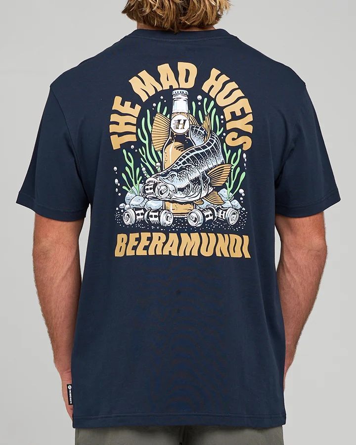 The Mad Hueys Beeramundi Tee combines comfort with distinctive style, crafted from premium 100% cotton that delivers breathability and durability through extended wear. The chest and back graphic design makes a bold statement, whether you're heading to the beach or casual outings around town. This versatile piece works as a standalone statement tee or layers effortlessly under jackets for cooler days. The quality cotton construction ensures the garment maintains its shape and colour vibrancy wash after wash, making it a reliable addition to any wardrobe.