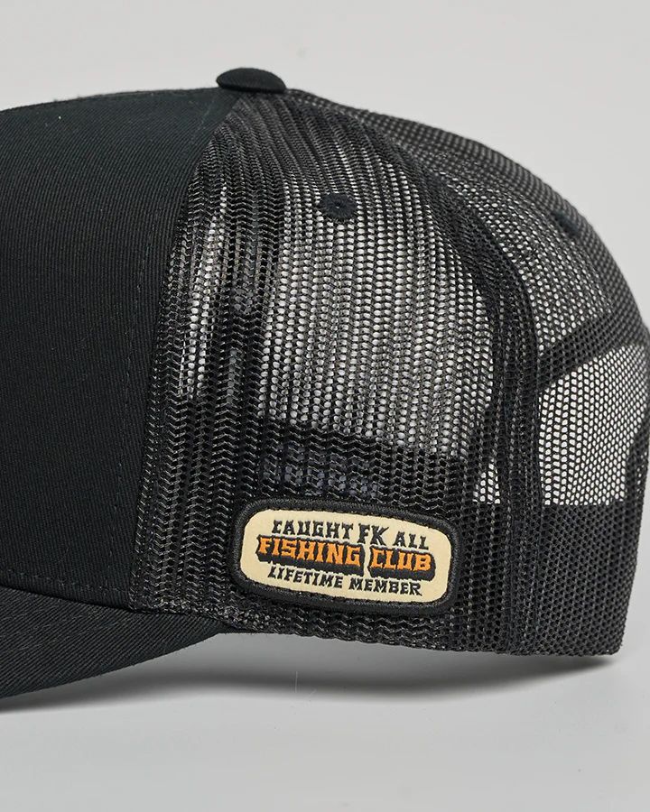 The mens Mad Hueys Caught FK All Skull Twill Trucker is an easy wear mens trucker featuring a snapback closure.