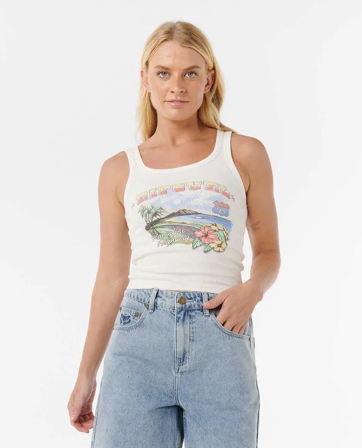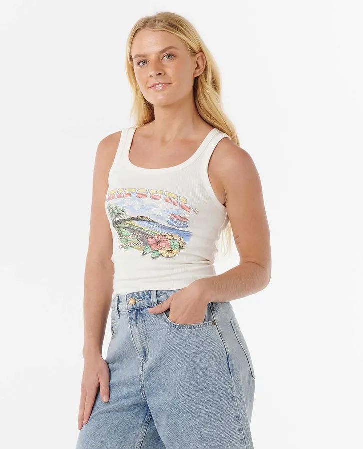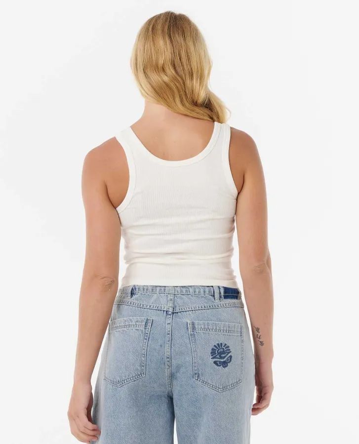 The Pacific Rider Ribbed Tank offers a tank fit cut in stretch cotton rib with a soft stone wash finish. Featuring a front print and woven flag label, it’s an effortless layering piece for sunny days and surfside vibes.