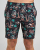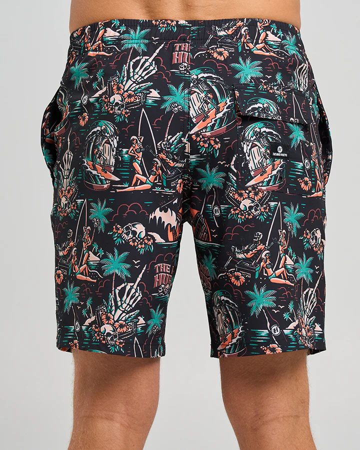 The Mad Hueys She'll Be Right 18 Swim Volley combines functionality and style with its 4-way stretch quick-dry fabric made from 92% polyester and 8% elastane, ensuring flexibility and rapid drying. Featuring an elastic waistband with a drawcord, it provides a secure, adjustable fit. The 18" leg length offers balanced coverage, while the all-over custom print adds distinct visual appeal. Practical side pockets and a back right patch pocket finished with a woven label enhance usability and detail, making this swimwear ideal for both active and casual water pursuits.