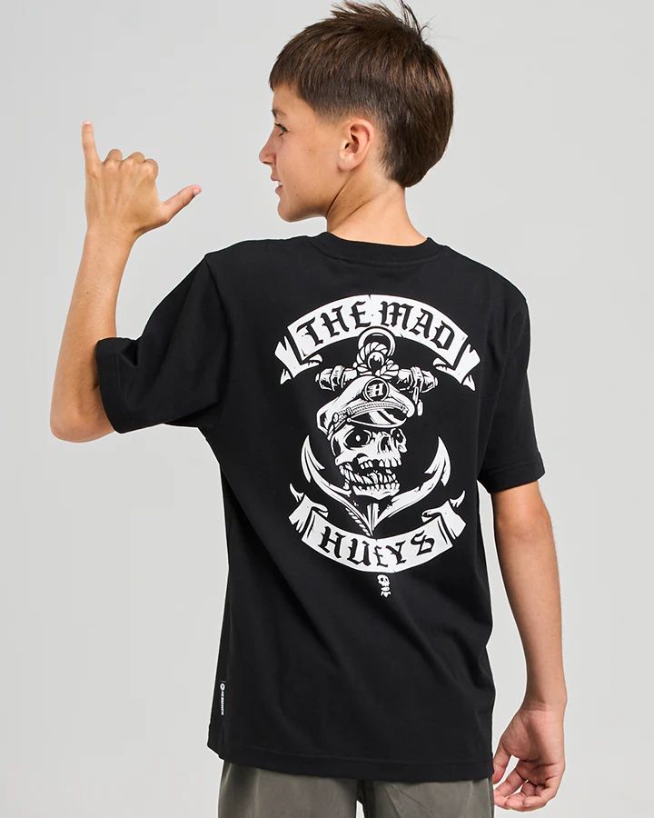 The Mad Hueys Youth Boys Sailor Anchor SS Tee is crafted from 100% cotton jersey at 180gsm, providing a soft yet durable fabric ideal for active wear. It features distinctive graphic prints on both the front chest and back, adding visual appeal. The ribbed neck band ensures a secure fit while retaining shape, complemented by a woven label in the sideseam for subtle branding. Designed in a youth regular fit, this tee offers true-to-size comfort and style for everyday use.
