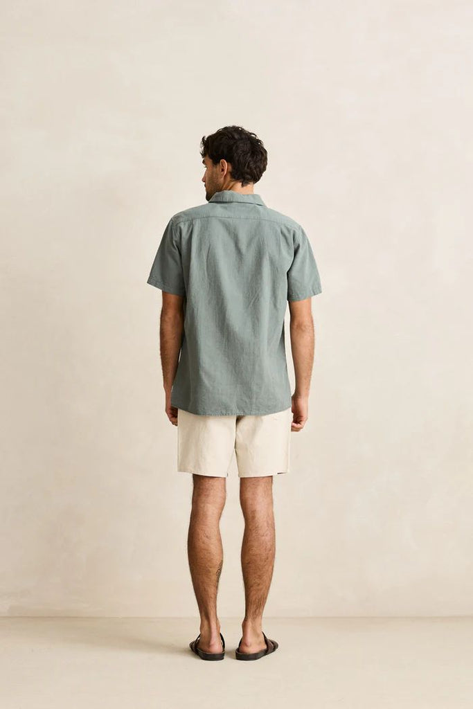 The Rhythm Classic Linen Short Sleeve Shirt is a soft-touch standard fit featuring a straight hem and a slightly wider fit, making it great for wearing open or buttoned down. The shirt is made from a cotton/linen blended material.