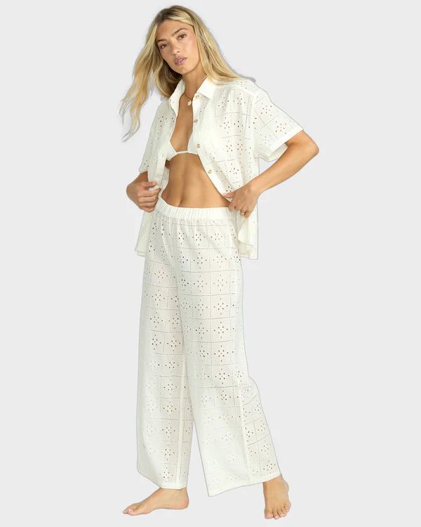 The Billabong Eyelet Crush Pants give all the vacay vibes. The pants are made from cotton, and feature an all over laser eyelet cut out. The pants feature a fitted waist band and are a wide leg fit.