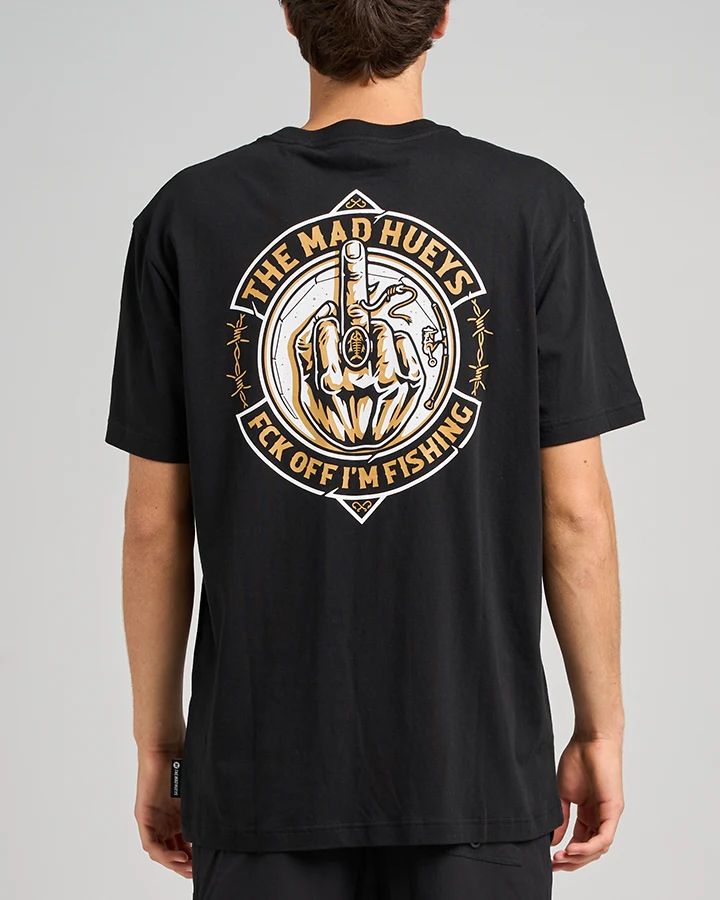 The Mad Hueys Fk Off Fish On SS Tee is a 100% cotton jersey that features a front chest and back graphic print, ribbed neck band, and woven label in the sideseam. With a regular fit, this shirt offers style and comfort, making it perfect for everyday wear.