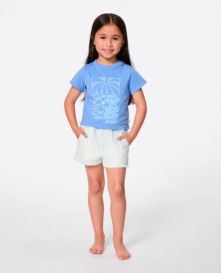The Rip Curl Mini Girls AOTS Standard Tee offers a comfortable standard fit and is crafted from 100% cotton jersey with a 160G weight. Its garment pigment dye and heavy enzyme wash deliver a soft, worn-in feel and unique colour depth. Thoughtful details include a woven flag label, a front print for style, and an inner neck print for added branding. This short-sleeve tee provides everyday comfort with a distinctive look, ideal for casual wear.